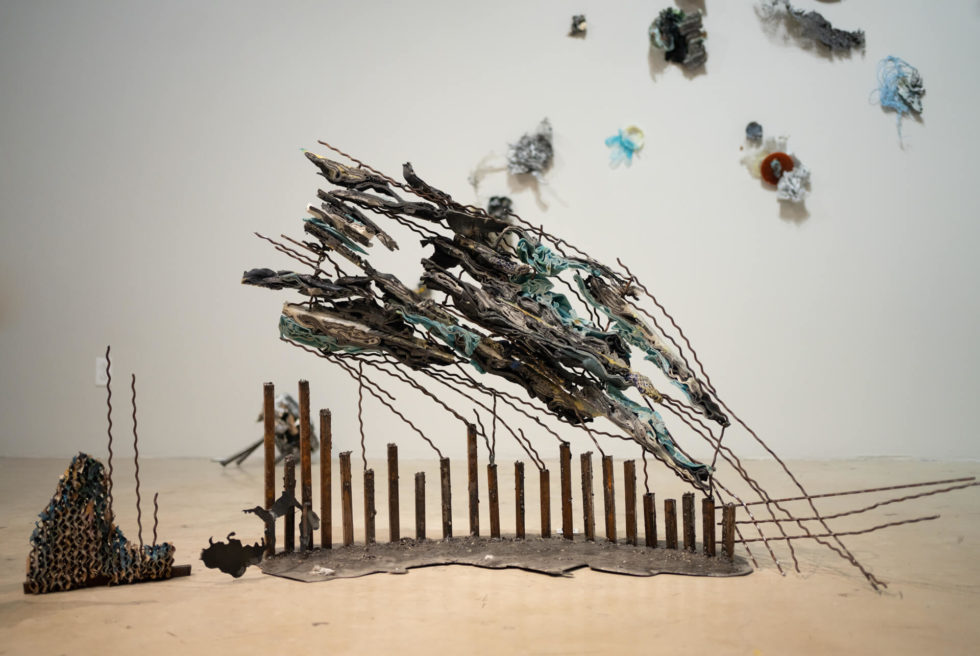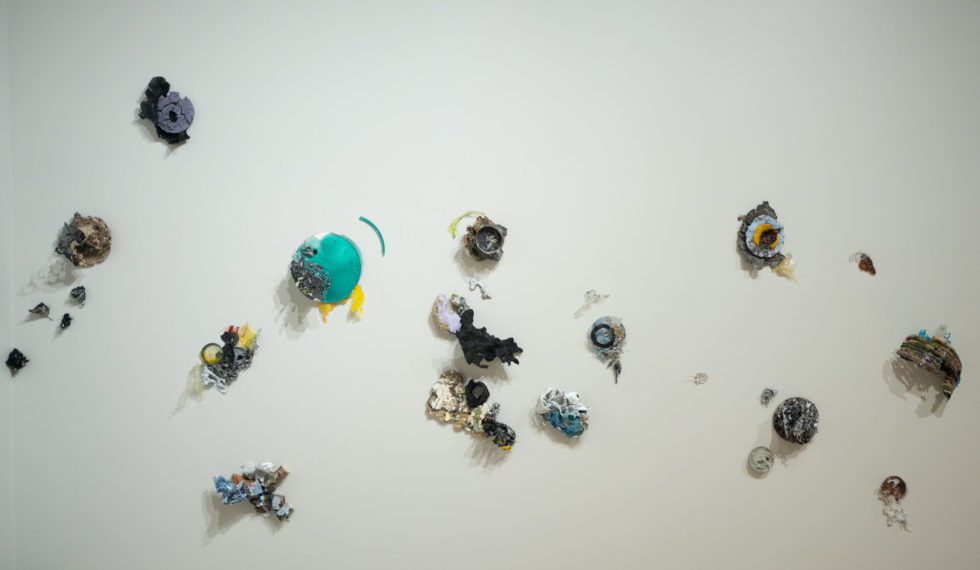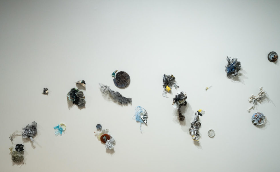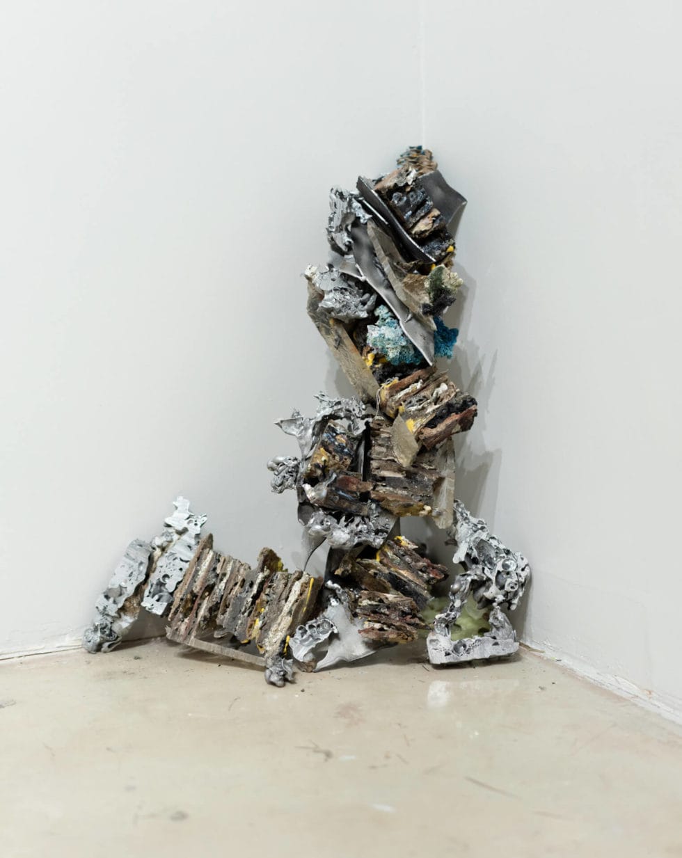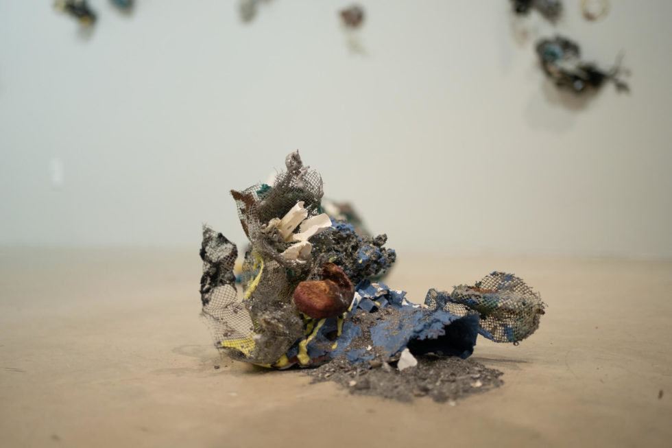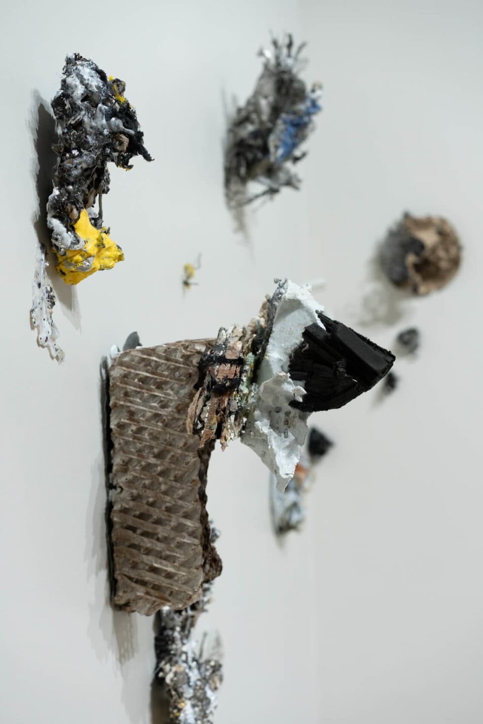 The objects I create are formed through accumulation and reformation. Each is an experiment that incorporates an array of materials, using a range of techniques. Strata of texture and color are displayed together in an arc with individual arrangements acting as samples of the core materials. Fragments, residue, and debris that is gathered, donated, or remnant from previous projects are assembled, deconstructed, rearranged, combined, dismantled, and assembled again. This body of work and the experience of my being are grounded in the constant bending, breaking, and reforming of matter through living systems on our planet.