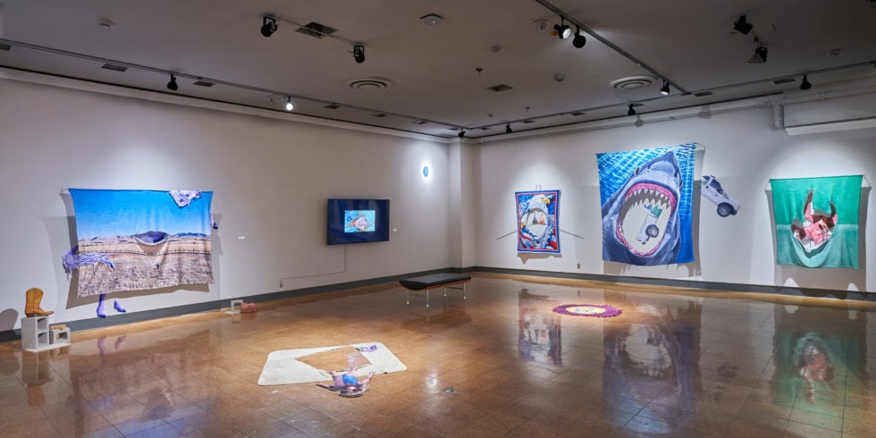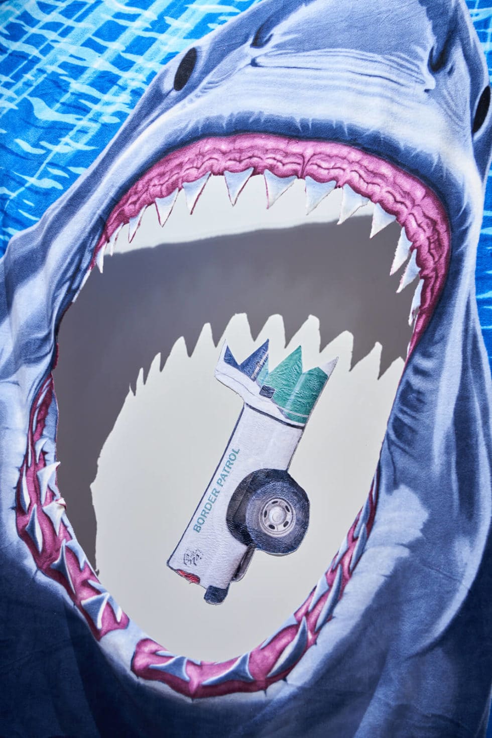 The reconstructed blankets are mock merchandise inspired by Becky and Kyle‘s travels to the borderlands and adjacent commercial district. The gaps in the assemblages create a space where hybrid identities exist within the downfalls of neoliberal capitalism. @Border_Becky is an ode to the resourceful immigrant hustlers, a prayer to asylum seekers, and an offering of much needed comedic relief in a time of high anxiety.