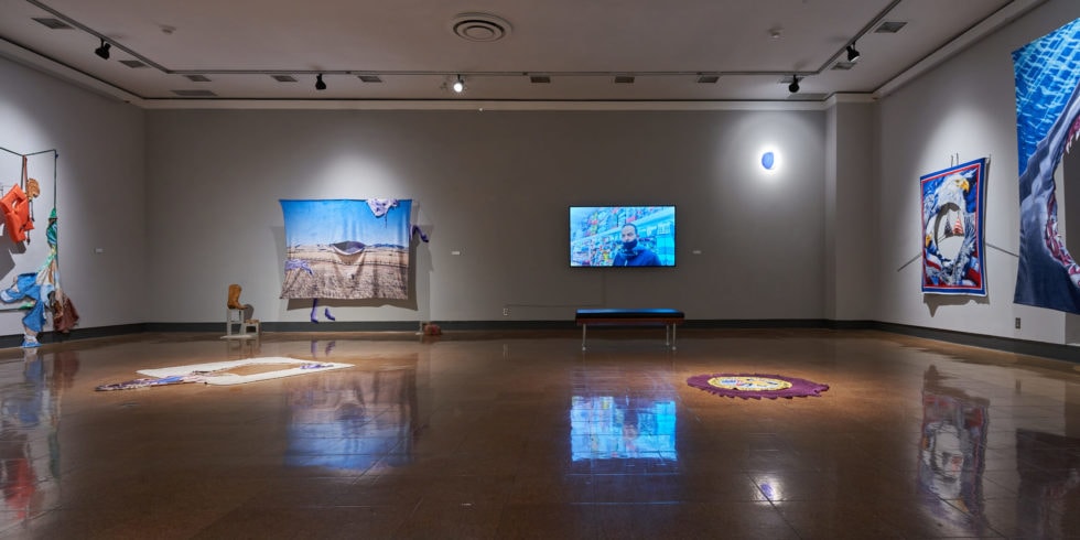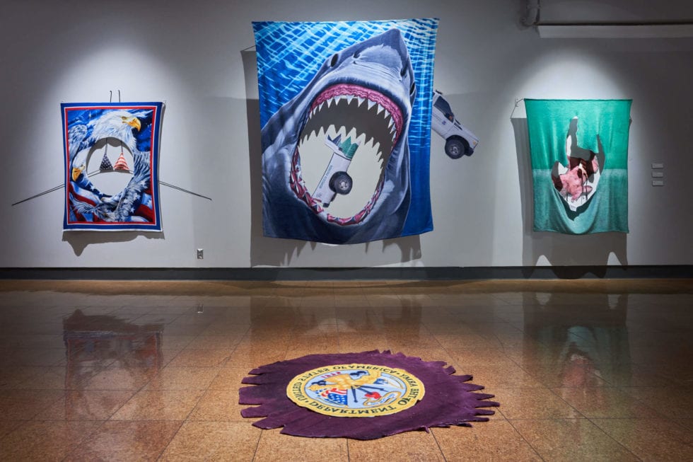@Border_Becky combines video artwork with fleece blanket assemblages to explore the intersection of immigration and gender identity through the lens of contemporary pop culture and mass media. I cut and reconfigure iconic material to skewer mainstream anti-immigration rhetoric, subvert the appropriation of Latinx culture, and queer mythologies of Americanness.