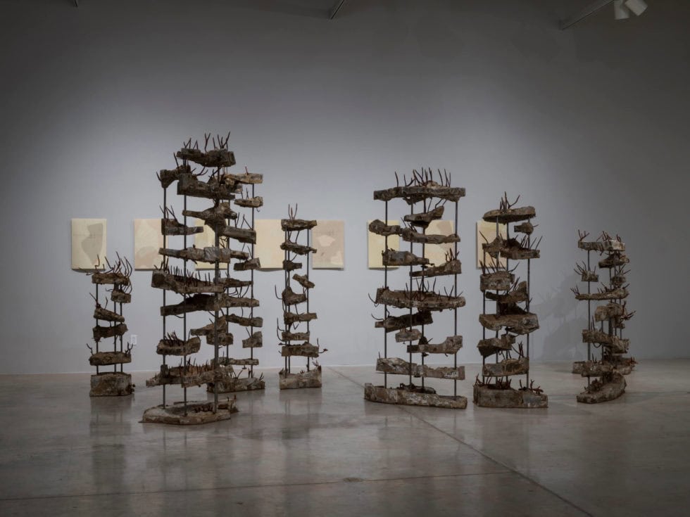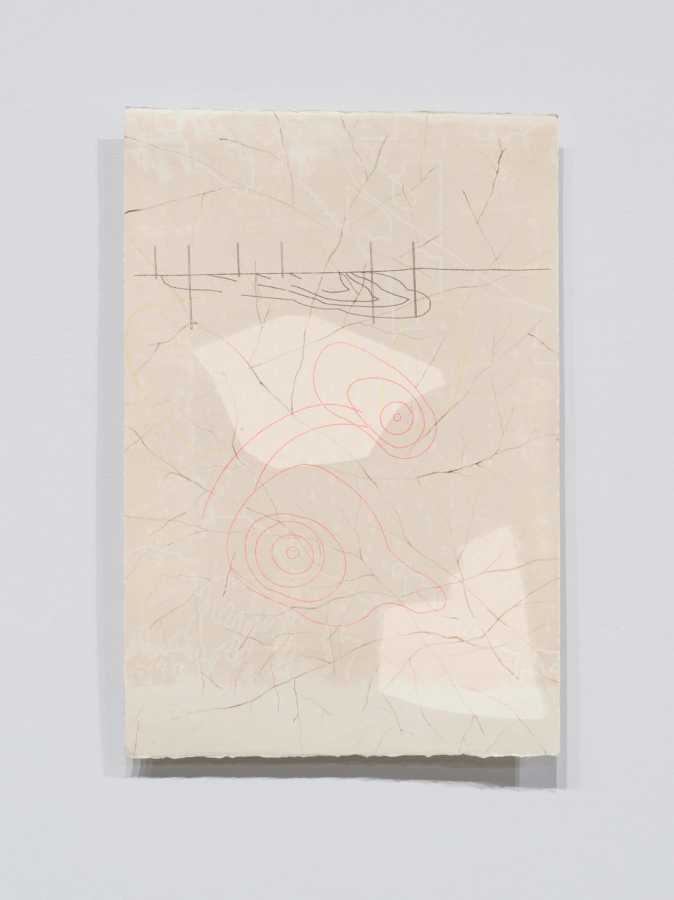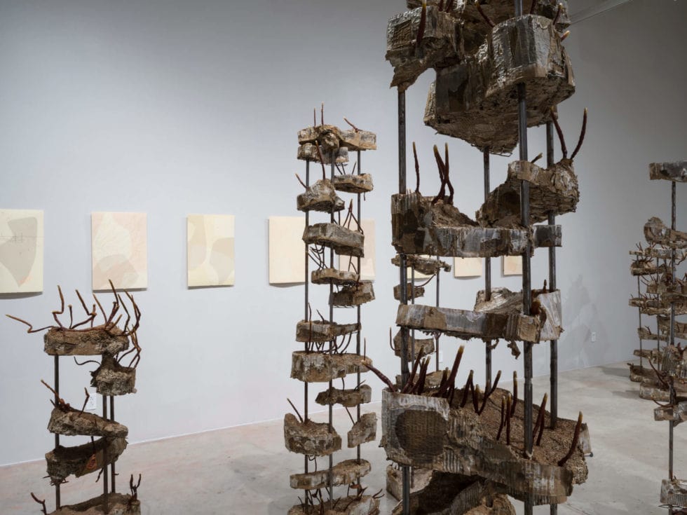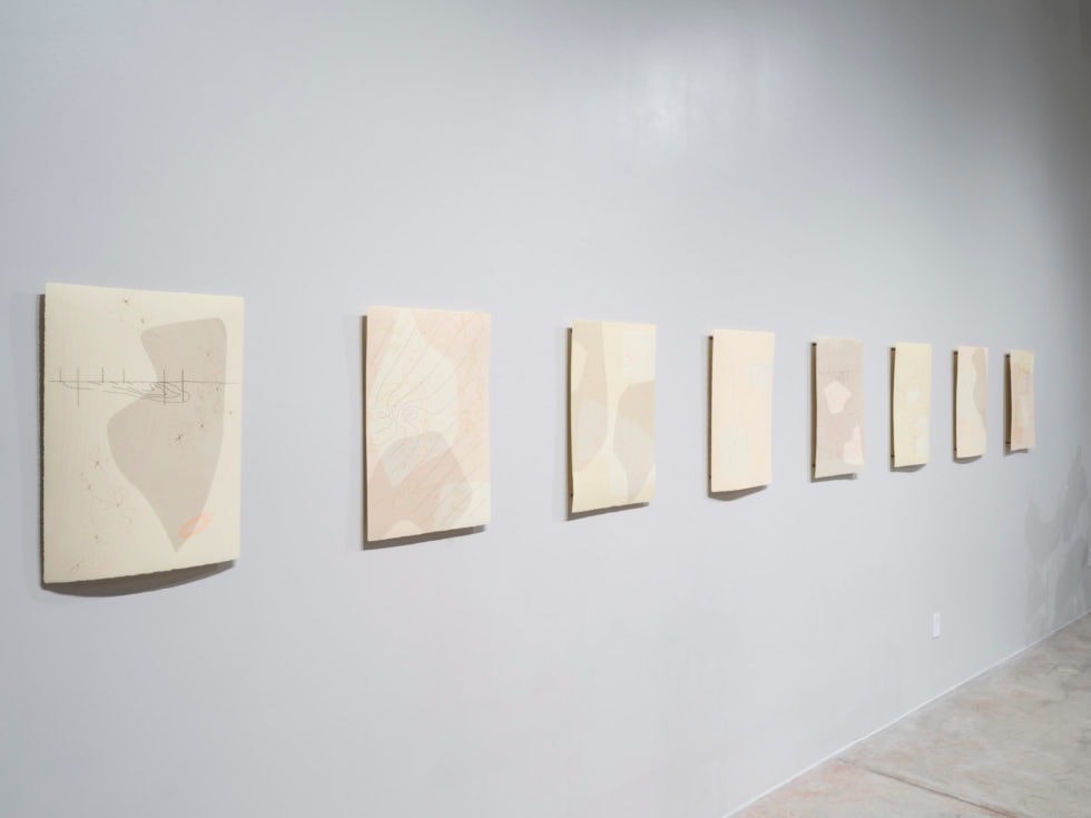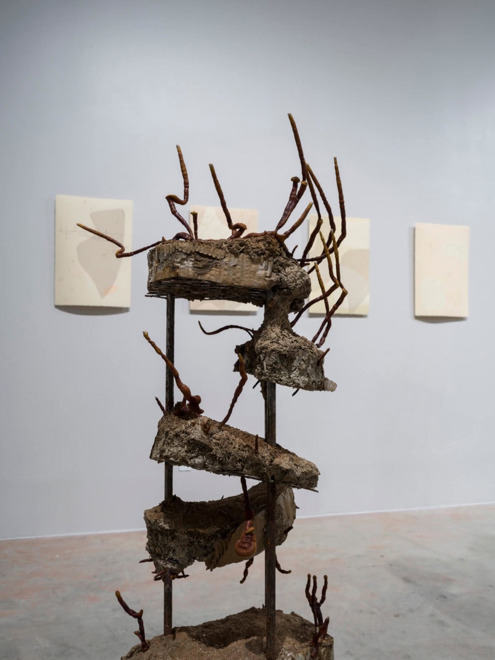 Eight drawings accompany the sculptures and pull from various sources related to the monitoring of landfills, including maps, contamination prediction models, and scientific diagrams. Layered within are hand-drawn interpretations of the microscopic mycelial systems painted with collected reishi spores. The abstracted marks oscillate between the micro and the macro to encompass the complexities of human and non-human relationships, creating an opportunity to reflect on our implicit participation in both.