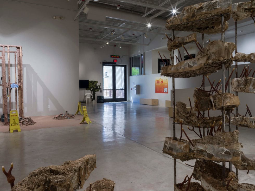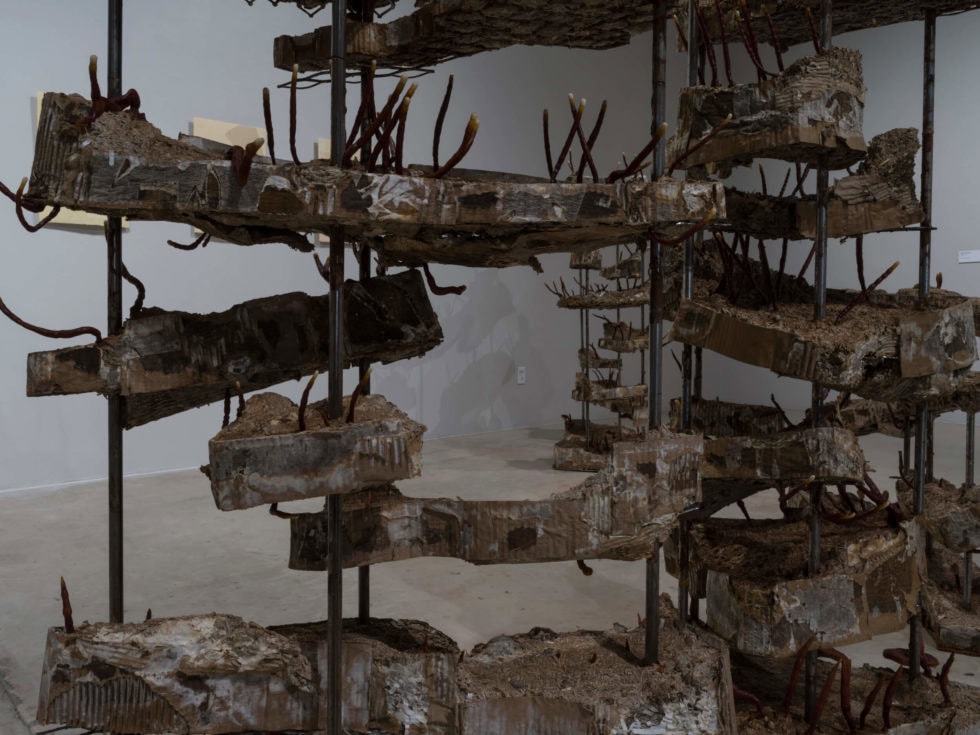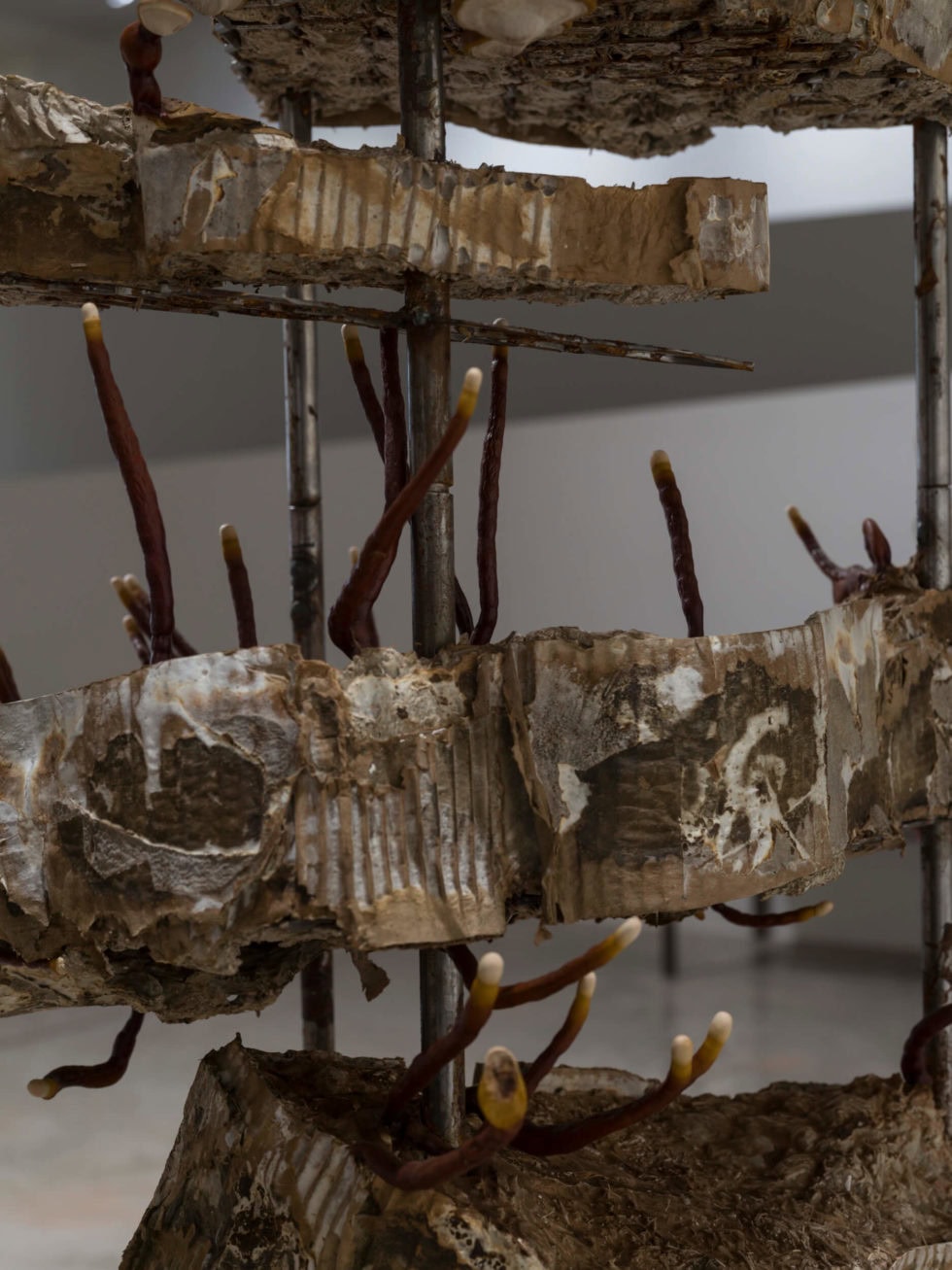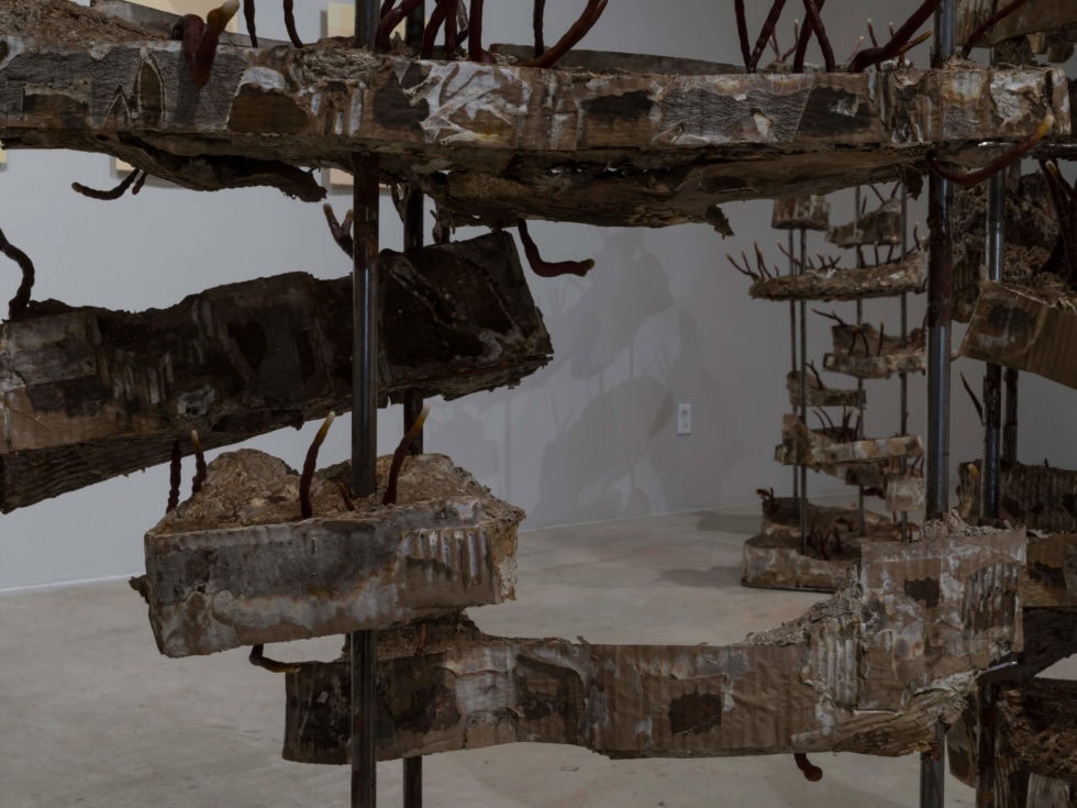 Each of the sculptures in Tangled Currents represents one of these sites and offers a speculative solution for their remediation. Arranged in a loose map, the forms are scaled to represent the shape and depth of the respective landfills. Reishi fruiting bodies (Ganoderma lucidum) twist and bend from each of the sculpture’s sections. Like a web of roots, the mushrooms make visible the unseen network binding the sculptures together.