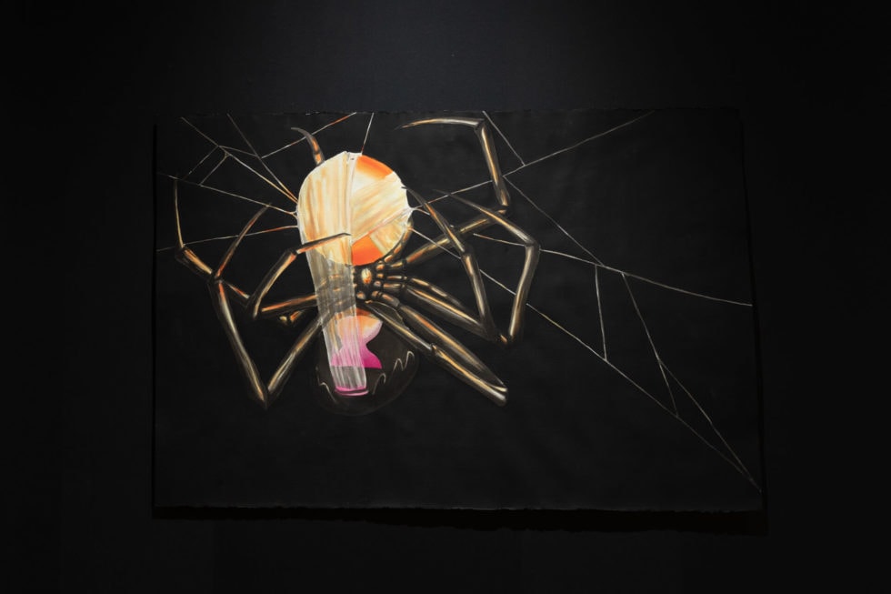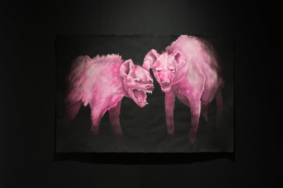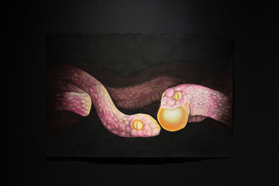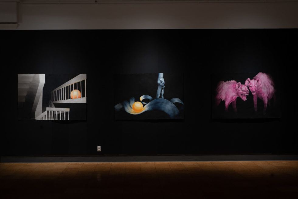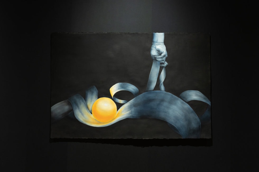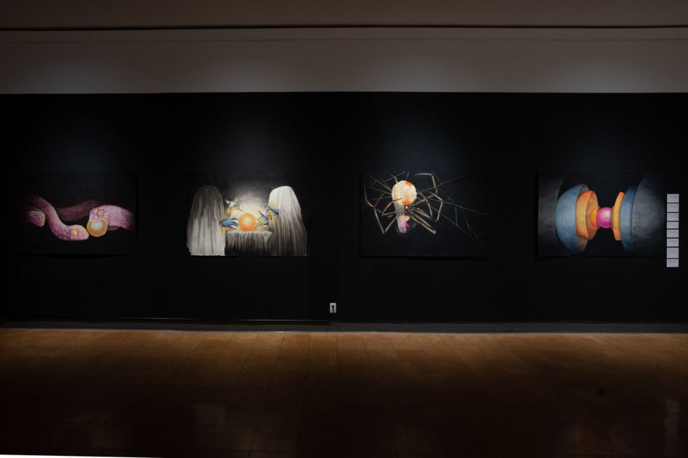 The subjects represented in this body of work appear from the black abyss. Dense, inky mist distorts and emphasizes their form. They are hidden and uncovered simultaneously, offering both questions and answers. Each work is a morphing riddle, or a liquid puzzle. By resisting the urge to impose our credulous desires upon these dreamy experiences, these symbols can exist in a realm detached from logic. The subjects within these works offer opportunities for new perspectives, new possibilities, and instances to practice nonattachment to our logical tendencies.