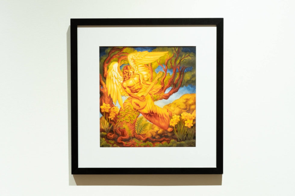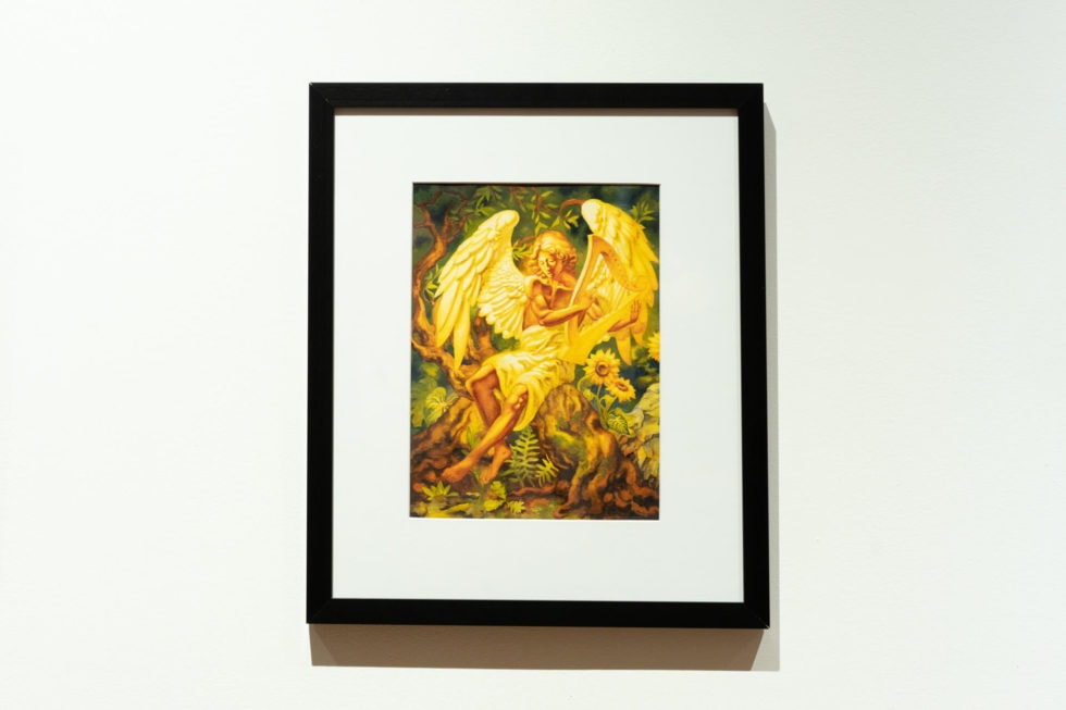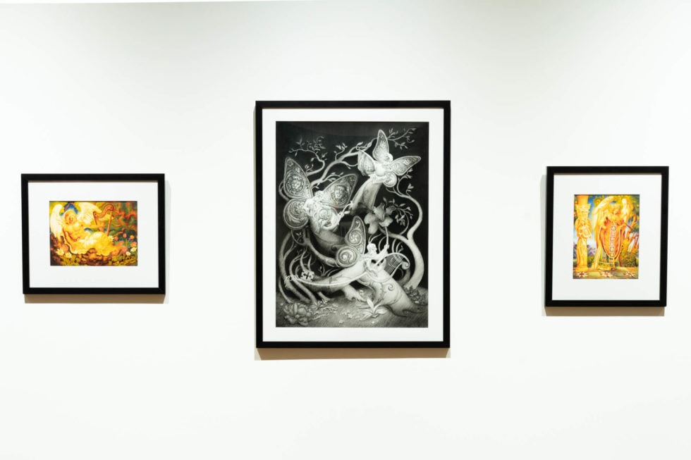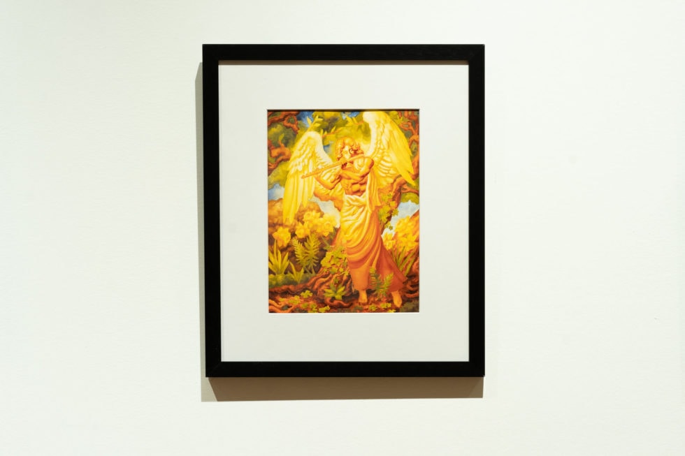 The presence of ornamentation in this work represents the extension of the natural world beyond where it ordinarily grows. As a result, many decorative components take on organic shapes. Ornament in these renditions can be found on the vestments, architecture, wings, trees, plants, and seeds. The large, decorated, egg-like shapes are the seeds which bloom into elaborately designed plants. The nature in these settings grows upon the playing of musical instruments found in the series’ universe.