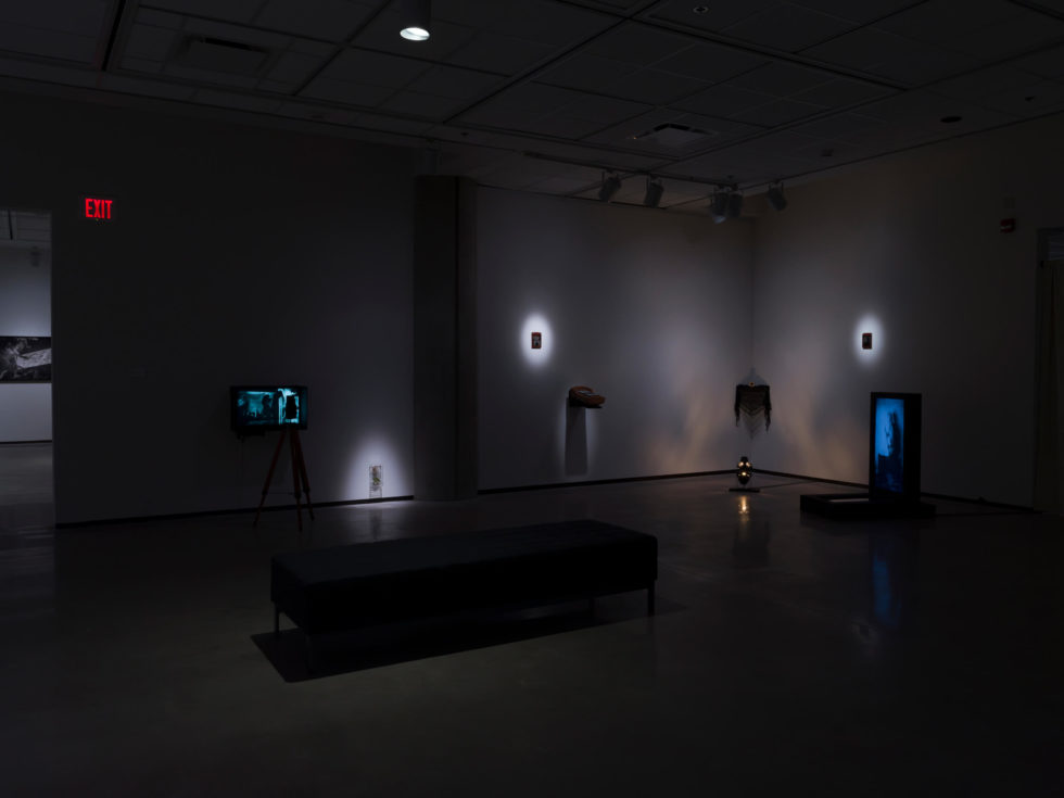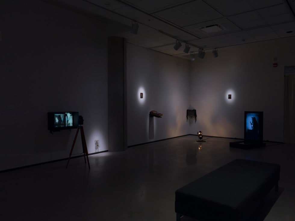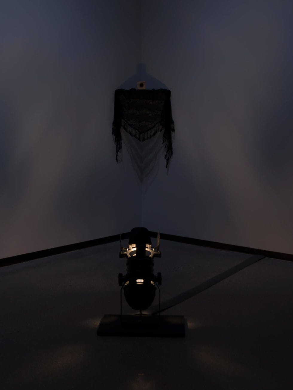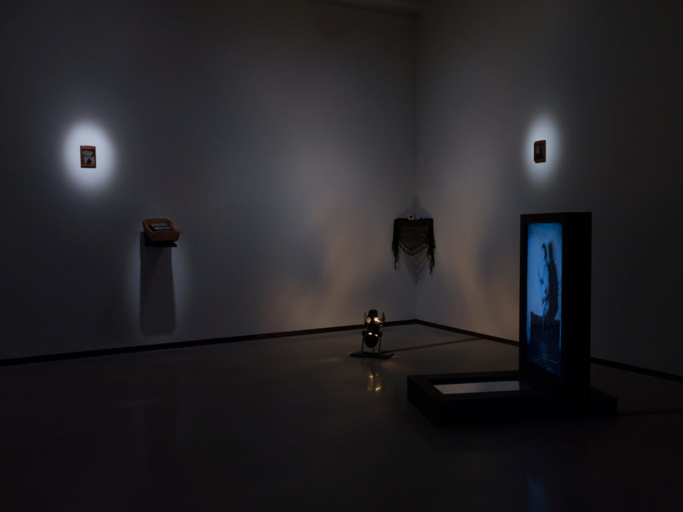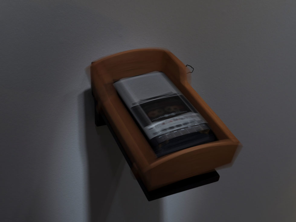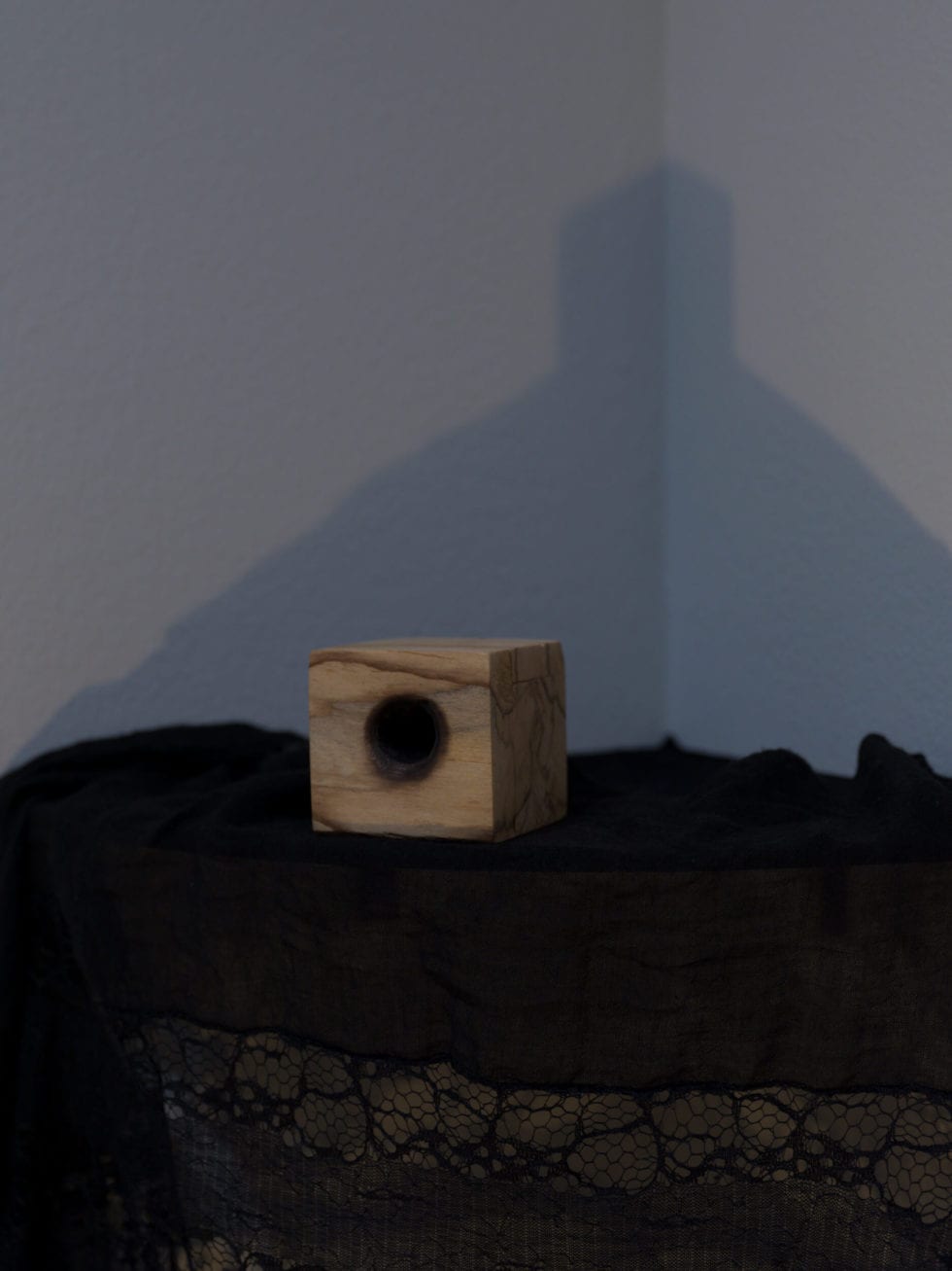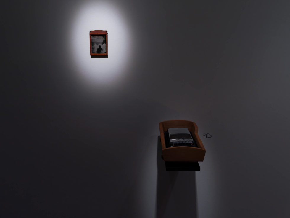 To expand the work’s sensory and interactive dimensions, a tape recorder and a small box made of Palo Santo wood invite the viewer’s engagement. Presence activates the installation’s performative space, requiring movement—walking around images and objects, leaning in, playing the tape recorder, and sensing the aroma from the wooden object.