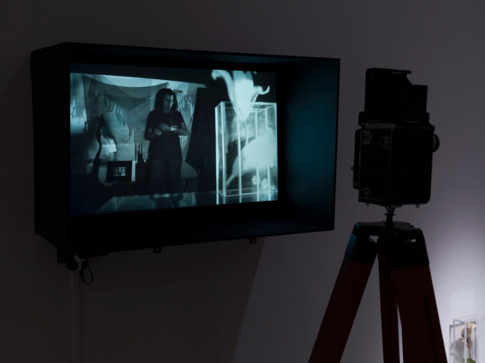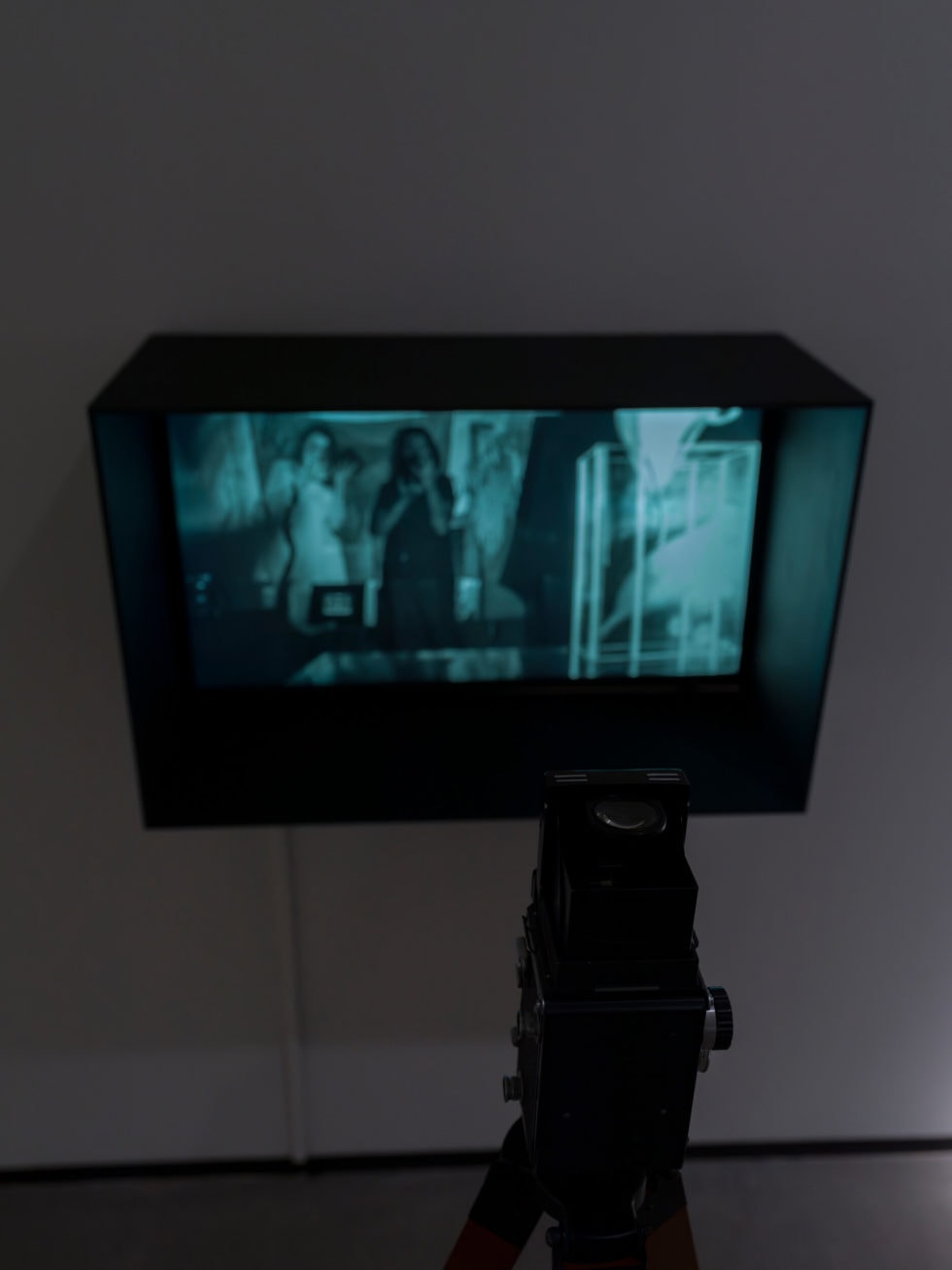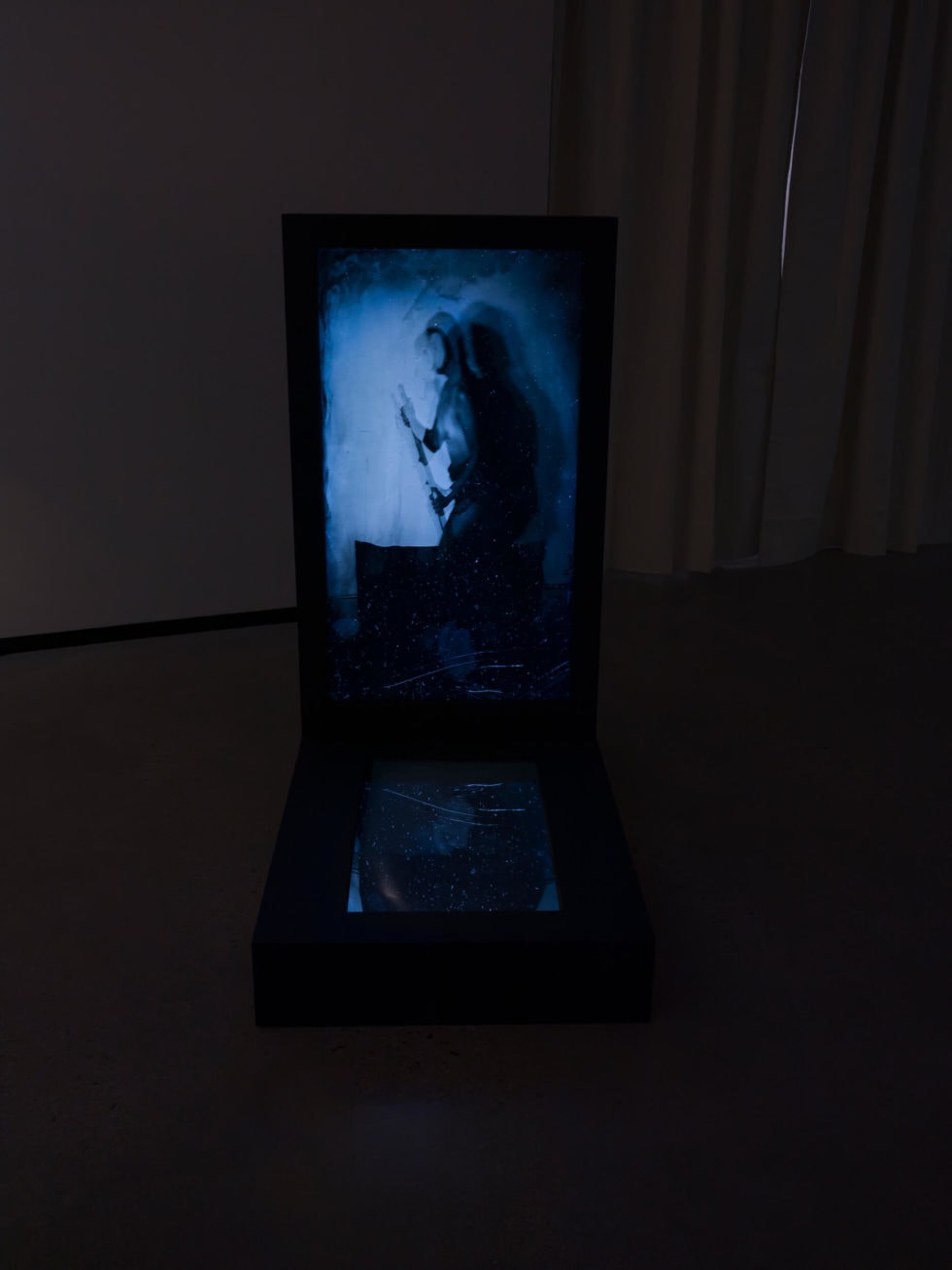 In aurora, I merge 19th-century wet plate collodion photography with contemporary video techniques, creating an interplay of light, shadow, and time. Monitors embedded within wooden frames reveal an ethereal figure suspended in swirling silver nitrate, evoking alchemical processes. A second video—a music performance inspired by the oldest known Babylonian lullaby—is experienced through a Rolleiflex camera, emphasizing mediated vision and historical fragmentation. Sung in both English and Portuguese, the lullaby is recorded on a deteriorating magnetic tape recorder, oscillating between silence and feedback, underscoring themes of translation, distortion, and intimacy.