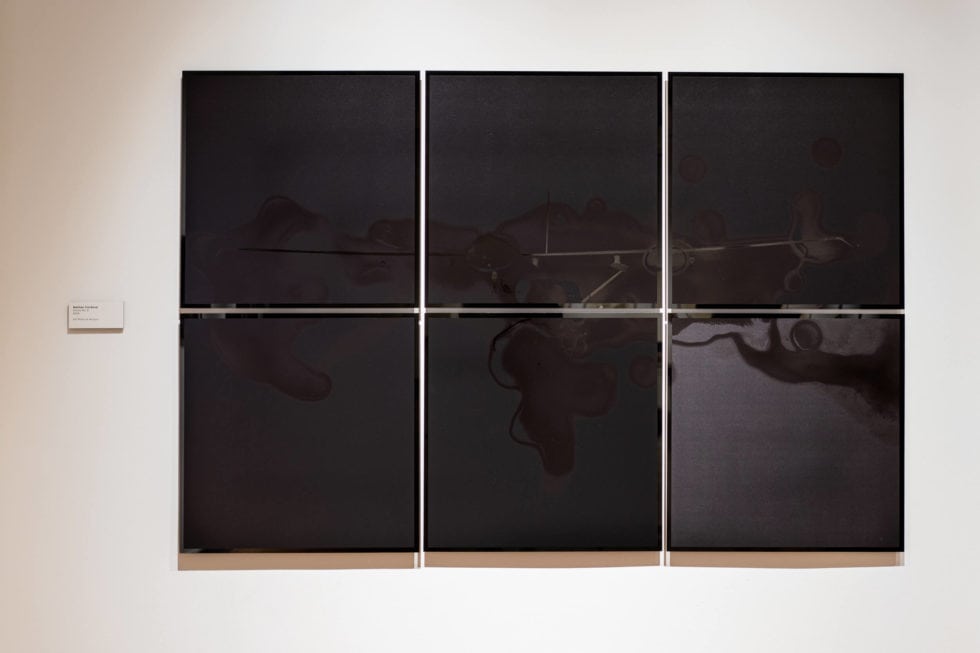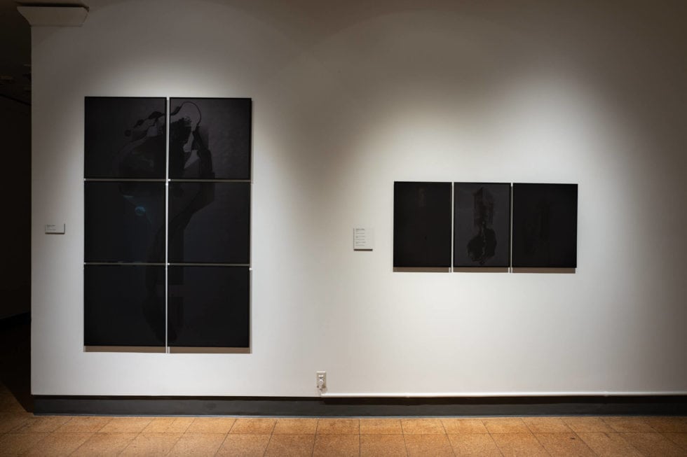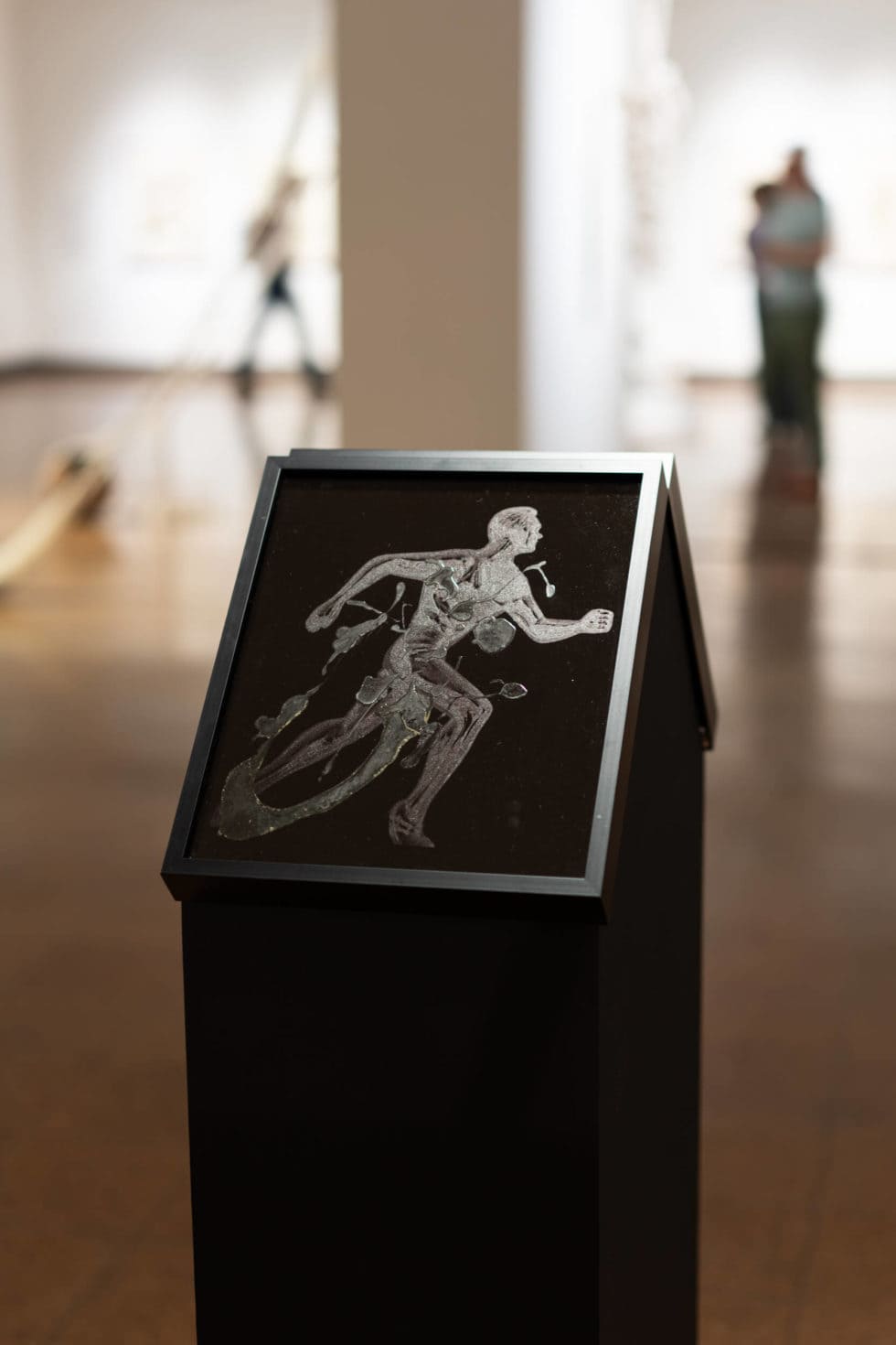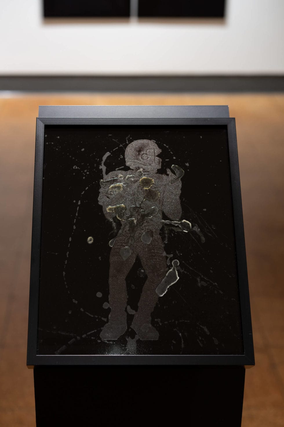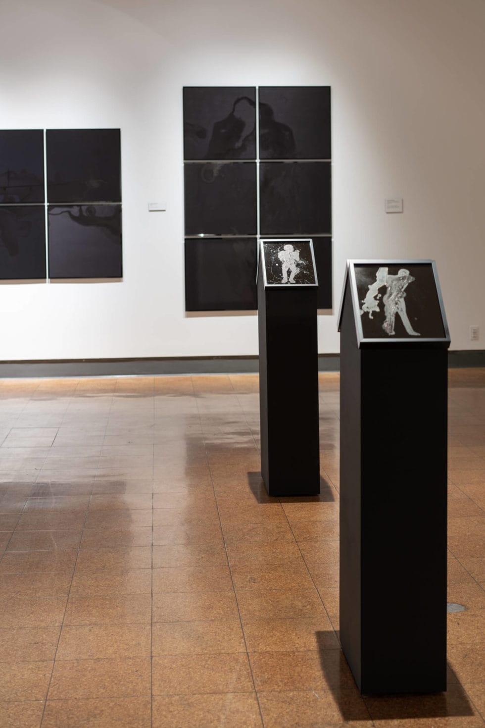 Blurring the boundaries between past and present, self, and other, I invite viewers to engage these collections on a visceral level through the presence of their own reflections in black acrylic surfaces mediated by images layered with physical ejaculate, traces of our sequential self-pleasure. Remixed marketing videos from The University of Arizona and Raytheon (now rebranded as RTX Corporation) point to their mutually beneficial relationship built on endless cycles of debt and death.