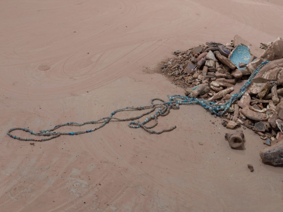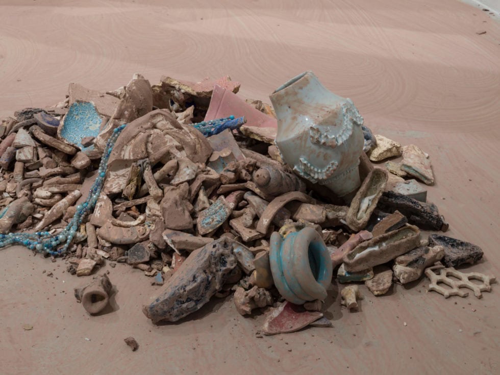 This labor becomes the catalyst for the transformation of cast-off ceramic fragments that are constantly being rearranged on the gallery floor. These shards are gathered from my collection of ceramic souvenirs, often discarded and forgotten, that remind me of my personal relationships. They are smashed down and integrated into piles that are then mopped into varying iterations throughout my performance. Much like our own context-specific identities, these piles take on aspects of each other, much like we do in our shifting relationships with others.