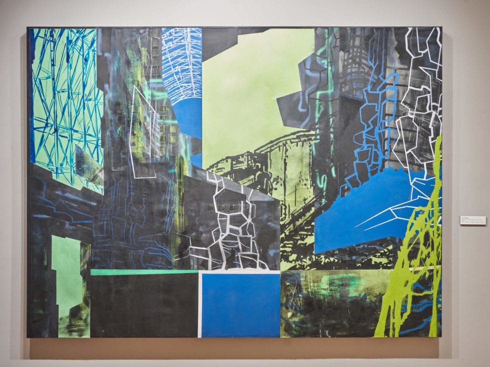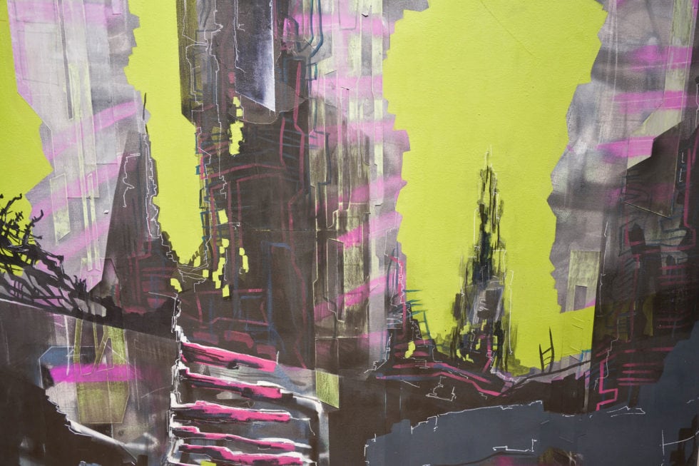 Material and visual endurance built and collapsed on upon each layer introduce an unread history to the landscape by destroying the information created through image appropriation and mark making before, turning each remain layer into a new world. Precision linework and perspective visually erode, decay, and are swallowed by gestural marks and scavenged paper, overlapping the world before. Neon colors allude to the energy of the environments as they leave trace histories throughout the pieces.