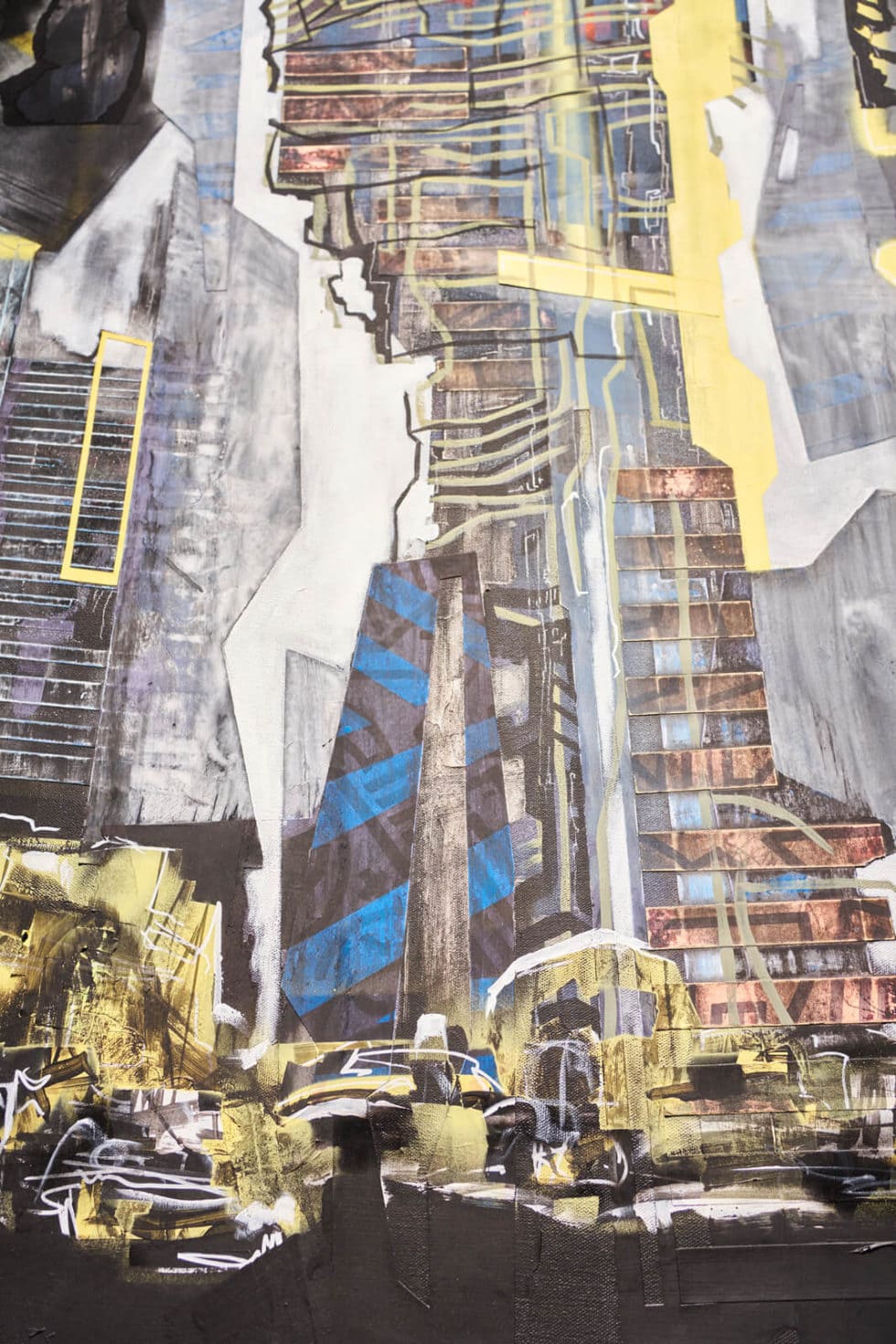 Building with scavenged imagery and mark making, this body of work depicts an urbanized landscape of abstracted chaos and apocalyptic destruction. Depicting what a structure was and what remains simultaneously, this apocalyptic landscape juxtaposes the value placed on a location’s visual written history and its unwritten future. Formal elements found in each structure’s remnants are deconstructed and reconstructed layer by layer through both application of materials and degradation of previous visual information. Recognizable imagery of destruction and conflict appropriated from historical artwork based upon war and ruin, science fiction narratives, and futurist architecture concepts add to the landscape for destructive context.